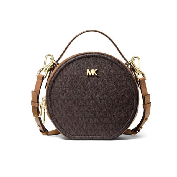 Michael kors MK Delaney 斜挎包採用時髦別緻的圓餅造型,經典品牌老花LOGO印花,裝飾鍍金金屬五金件,搭配經典品牌MK LOGO,裝飾鍍金經書包內空間充裕,可收納手機、卡包和口紅;可調節肩帶,令背挎更舒適、更美觀。