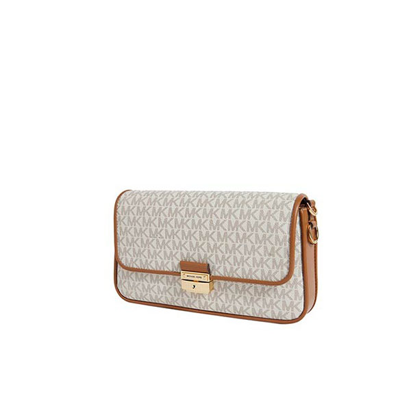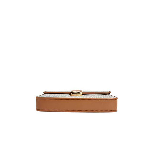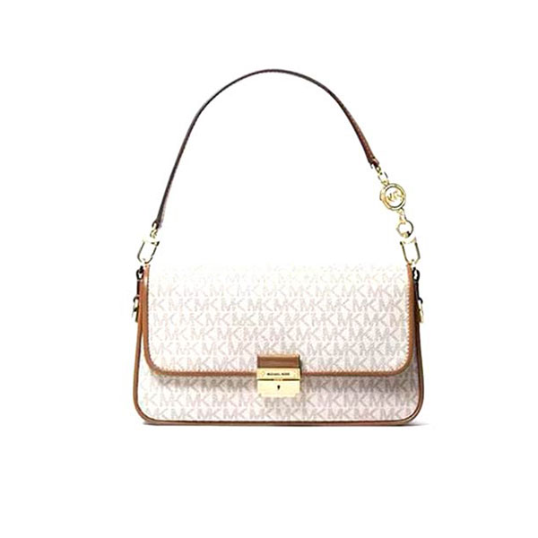 Michael Kors  Bradshaw2021春季新款小號腋下包,回歸氣質經典的棕色色系,輕松應對多種場合,無論是職場裏優雅幹練的精英,還是聚會裏靈動可愛的女孩,老花腋下包匹配各種穿搭可能,隨心而變。手袋開合的鎖扣靈感源自羅馬建築的柱體,簡約樸素的基本線條裝飾,突顯手袋簡潔廓形,兼具古典美感。mk 單肩包包袋配有兩條可拆卸調節皮革肩帶,短肩帶一側飾有雙圈MK魅力圓環,質感十足,將包袋變身時尚腋下包,長肩帶則實現包袋單肩、斜挎背法,多種背法點綴日常造型。
