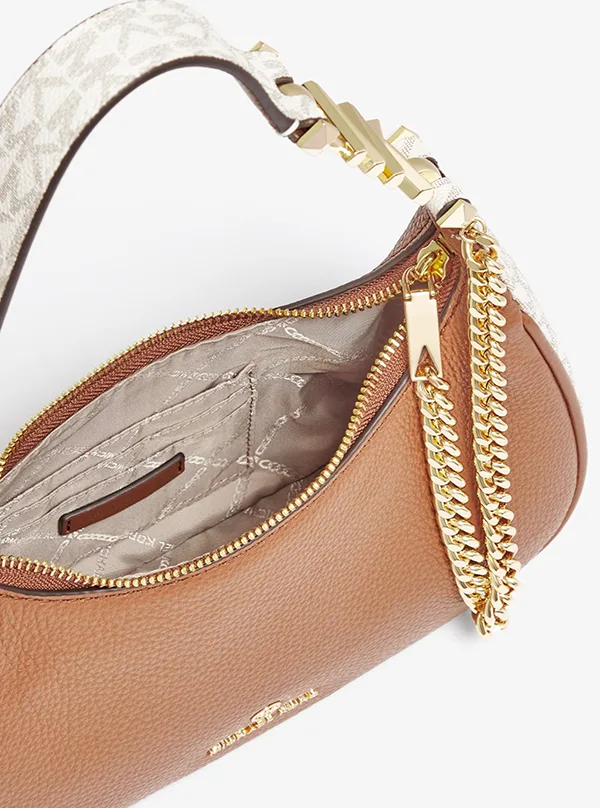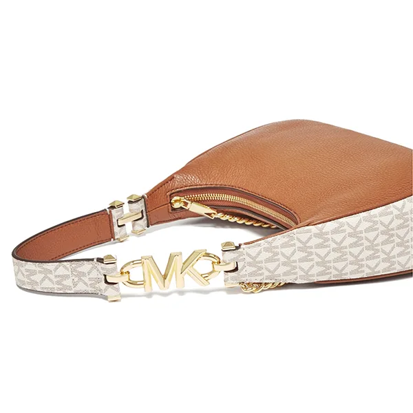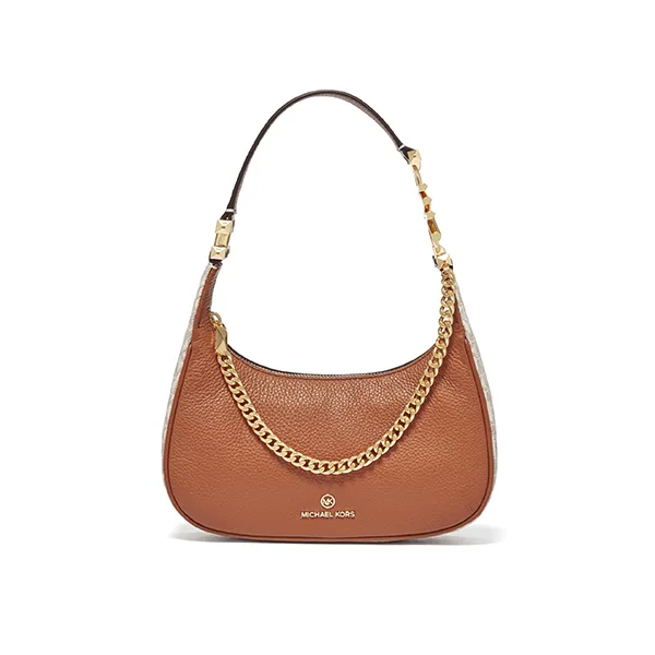 此款 Michael Kors Piper 小號老花鏈條單肩包,時下流行的腋下包造型,設有可調節純色皮革肩帶和金屬鏈條短肩帶,集潮流與實用為壹體。包身採用純棕色皮革打造,上綴低調Logo金屬件,mk單肩包側面採用白色品牌標誌線 logo 印花拼接,細節處彰顯品牌質感。