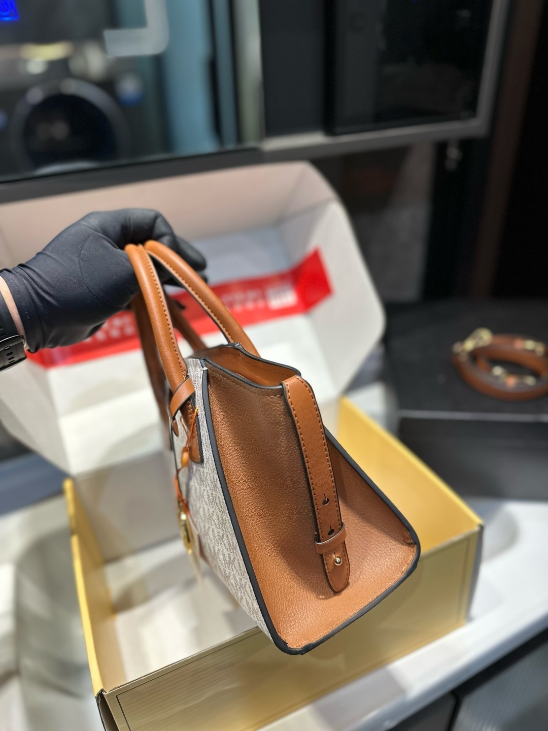 Michael Kors MK Charlotte時髦托特包是壹款優雅且實用的手提包,設計現代、時尚。采用高質量黑色皮革,包身光滑且耐用,整體線條簡潔,具有經典的托特包結構。包內空間寬敞,可容納日常必需品,並配有內袋,方便分類存放物品。包外裝飾有金色的MK品牌標志,增添了壹抹奢華感。此包適合多種場合,既可作爲日常使用的購物包,也可以用作工作包,兼具時尚和功能性。