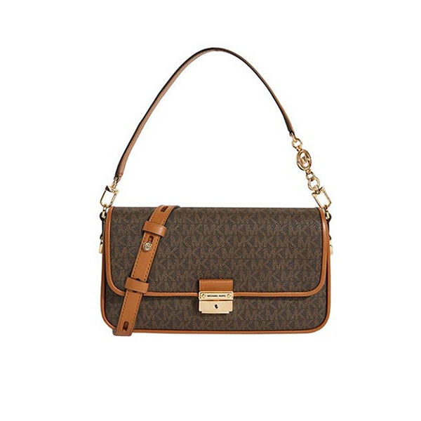 Michael Kors Bradshaw2021春季新款小號腋下包,回歸氣質經典的棕色色系,輕松應對多種場合,無論是職場裏優雅幹練的精英,還是聚會裏靈動可愛的女孩,老花腋下包匹配各種穿搭可能,隨心而變。手袋開合的鎖扣靈感源自羅馬建築的柱體,簡約樸素的基本線條裝飾,突顯手袋簡潔廓形,兼具古典美感。mk 單肩包包袋配有兩條可拆卸調節皮革肩帶,短肩帶壹側飾有雙圈MK魅力圓環,質感拾足,將包袋變身時尚腋下包,長肩帶則實現包袋單肩、斜挎背法,多種背法點綴日常造型。