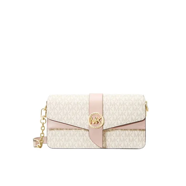 新款Michael Kors Greenwich 中號老花腋下單肩包,包身採用品牌標誌性 Logo 印花打造。長款翻蓋設計,包蓋別出心裁的選用純色皮革飾帶和金色圓形 Logo 金屬件裝飾,細節處彰顯品質。mk 斜背包內部空間充裕,可以輕鬆容納您的隨身物品。鏈條與皮革拼接肩帶增添潮流個性。不妨搭配本季新款連衣裙,打造優雅造型。