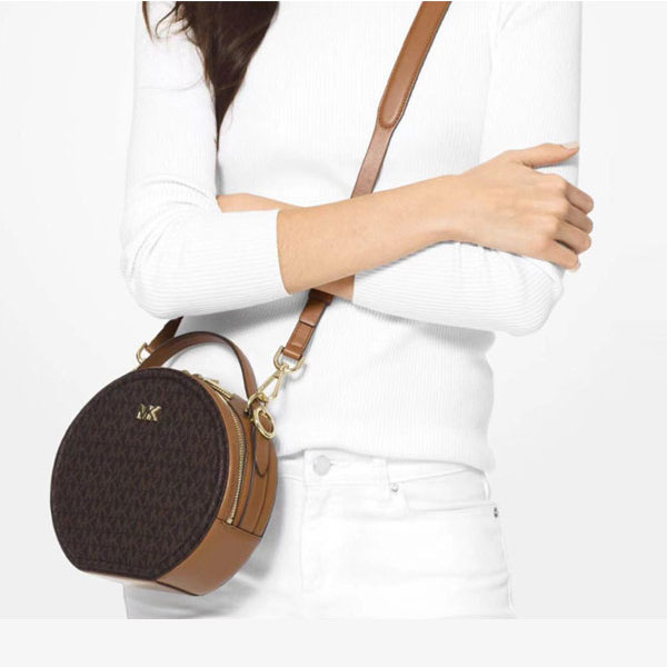 Michael kors MK Delaney 斜挎包採用時髦別緻的圓餅造型,經典品牌老花LOGO印花,裝飾鍍金金屬五金件,搭配經典品牌MK LOGO,裝飾鍍金經書包內空間充裕,可收納手機、卡包和口紅;可調節肩帶,令背挎更舒適、更美觀。