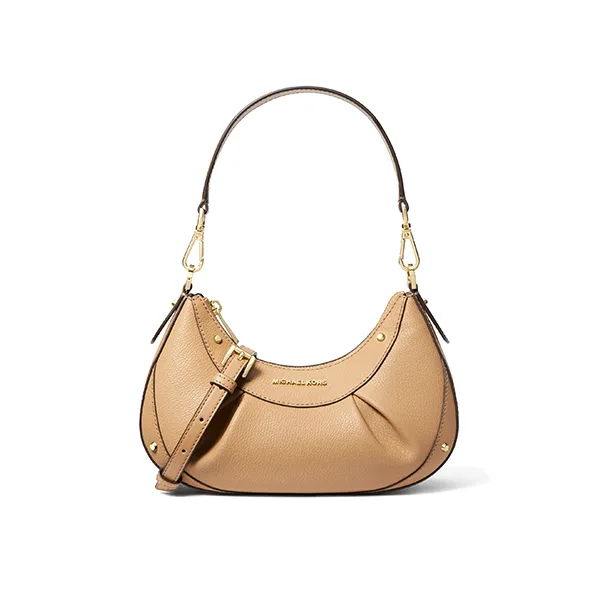 此款 Michael Kors Enzo 小號皮質斜挎包,採用優雅駝色皮革打造時下流行的豌豆包造型,設有可調節長肩帶和手提短肩帶,拉鏈開合,集潮流與實用為一體。mk 斜肩包身上綴低調 Logo 金屬件和褶襇造型,細節處彰顯品牌質感。