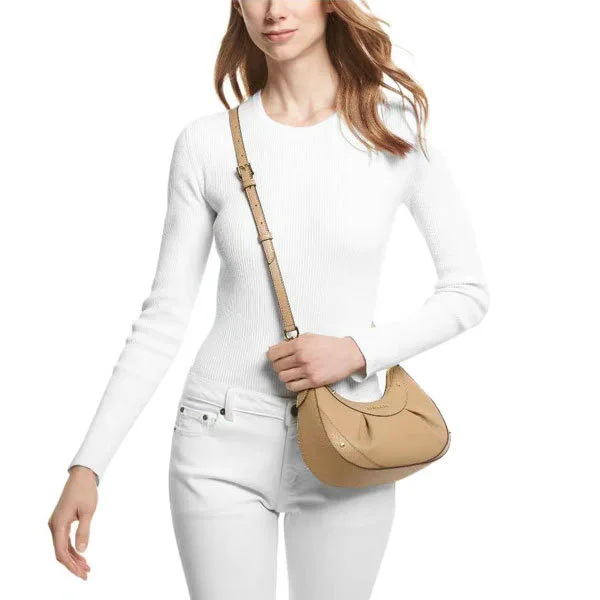 此款 Michael Kors Enzo 小號皮質斜挎包,採用優雅駝色皮革打造時下流行的豌豆包造型,設有可調節長肩帶和手提短肩帶,拉鏈開合,集潮流與實用為一體。mk 斜挎包身上綴低調 Logo 金屬件和褶襇造型,細節處彰顯品牌質感。