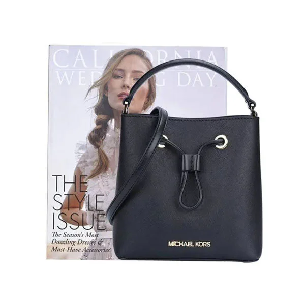 Michael Kors MK Suri 小號經典防刮皮革抽繩水桶包 單肩斜挎包 女款 黑色以其簡約而奢華的設計而著名,深受時尚愛好者喜愛。此款包包採用優質Saffiano皮革,質感細緻,且具有耐用性。黑色外觀百搭,無論是日常出街還是辦公場合,都能輕鬆搭配。mk 單肩包內空間寬敞,設計合理,能夠容納筆記本、手機、錢包等日常必需品。配有雙手提把和可調式肩帶,無論是手提還是肩背,都能提供舒適的使用體驗。精緻的MK金色字母標誌,彰顯品牌獨特的奢華風格,讓這款包成為時尚潮流的代表。