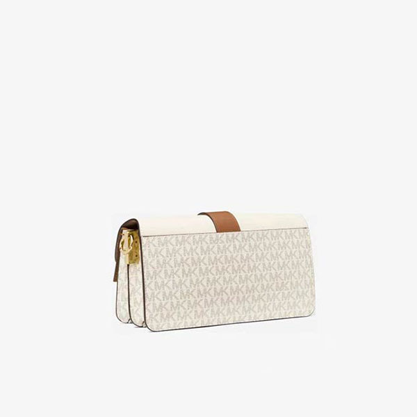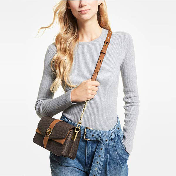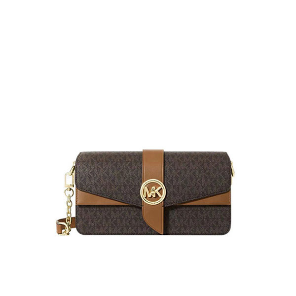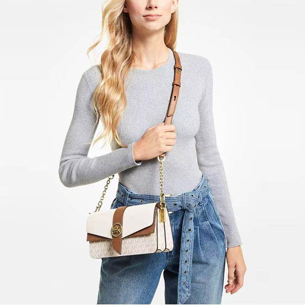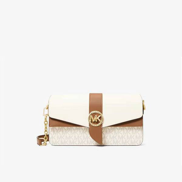 新款Michael Kors Greenwich 中號老花腋下單肩包,包身採用品牌標誌性 Logo 印花打造。長款翻蓋設計,包蓋別出心裁的選用純色皮革飾帶和金色圓形 Logo 金屬件裝飾,細節處彰顯品質。mk 斜挎包內部空間充裕,可以輕鬆容納您的隨身物品。鏈條與皮革拼接肩帶增添潮流個性。不妨搭配本季新款連衣裙,打造優雅造型。